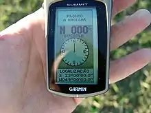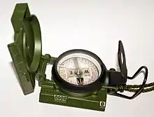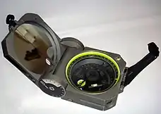 В геодезии и строительстве для определения углов применяют буссоли — особый вид компаса повышенной точности. Буссоль имеет визирное приспособление, например, диоптр. Для повышения точности отсчётов плоская магнитная стрелка может устанавливаться на ребро. Часто вместо стрелки применяется картушка[11][12]. Шкала буссоли часто бывает направлена против часовой стрелки («обратная», или буссольная шкала), что облегчает прямое, без вычислений, взятие магнитных азимутов[13].