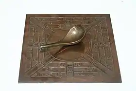 Компас был изобретён в Китае при династии Сун и использовался для указания направления движения по пустыням (подробнее см. четыре великих изобретения). Магнитное приспособление для определения сторон света в дневное время суток впервые упоминается в книге Цзэн Гунляна «Собрание важнейшего из военных канонов», датируемой 1044 годом. В ней и работе учёного Шэнь Ко представлены два вида компаса: «указывающая юг рыба» (тонкая железная пластина в виде рыбы, которая особым образом нагревалась и погружалась в воду) и «указывающая юг игла» (намагниченная игла посредством трения о магнит)[3]. В трактате Шэнь Ко упоминается также более сложный компас (механический) — Колесница, указывающая на юг, где не использовались магнетические свойства[4]. Ещё два варианта изготовления компасов известно из трактата «Обширные записки о лесе дел» Чэнь Юаньцзина (издана в 1325 году). Первый из этих приборов представлял собой деревянную рыбу, в нижнюю часть которой был вмонтирован магнит. Рыба изготавливалась таким образом, чтобы она могла находиться на поверхностности воды в горизонтальном положении, но при этом немного была в неё погружена. Со стороны головы магнит соединялся проволокой, с таким расчётом, что его выгнутая часть приподнималась над водой. Когда деревянную рыбу помещали в воду, её голова направлялась в сторону юга[3]. Юаньцзин показал устройство другого компаса, по преданию также изобретённого даосскими бессмертными («магами»). В деревянную черепаху был помещён магнит, соединявшийся с иглой, словно хвост у черепахи. На её «брюшке» находилось отверстие, через которое она закреплялась на вертикальной булавке, изготовленной из бамбука. Это было сделано с таким расчётом, чтобы конструкция могла беспрепятственно перемещаться. При необходимости установления стороны света магнитный «хвост» черепахи поворачивался на юг. Такое приспособление рассматривается как прообраз магнитных компасов современной системы[5].