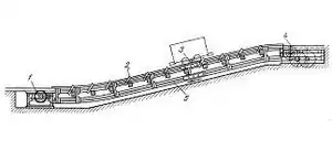 Компенсатор высоты: 1 — натяжное устройство; 2 — удержиивающие ролики; 3 — движущие ролики; 4 — приводная звёздочка; 5 — направляющие