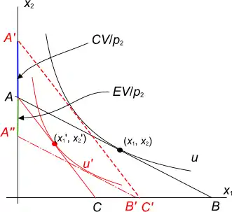 При изменении относительного уровня цен (изменяется наклон бюджетной линии AB, теперь это AC) потребитель переходит с уровня благосостояния u на новый уровень u`. Чтобы он вернулся на прежний уровень благосостояния при новых ценах, его доход должен увеличиться на величину, соответствующую СV (сдвиг бюджетной линии в A`C`).