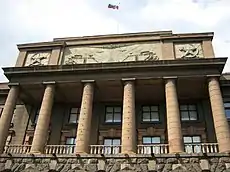 Центром композиции главного фасада является ризалит с сильно выступающим шестиколонным портиком, опирающимся на аркаду, завершённый фронтоном с бетонным рельефом на тему несокрушимости Красной армии, выполненный по эскизу А. М. Дукельского.