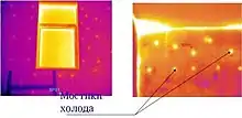 Тепловизионная съемка трехслойной стены с металлическими гибкими связями показывает большое количество точек темно-оранжевого цвета — это и есть «мостики холода» — места расположения металлических гибких связей, через которые происходят теплопотери (рис. 3). Поэтому очень важно использовать гибкие связи из материалов с низкой теплопроводностью — стекло- и базальтопластика. Так, при использовании композитных гибких связей «мостики холода» не образуются и происходит снижение теплопотерь до 34 %, что значительно снижает затраты на отопление и эксплуатацию здания.