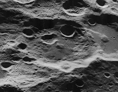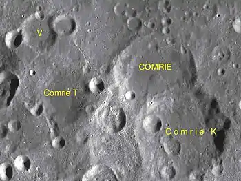 ![]() Комбинация снимков программы Lunar Orbiter. Кратер Комри в центре снимка, в нижней части сателлитный кратер Комри K. | |