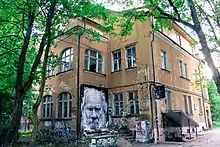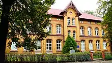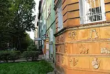 - Жилой дом (№ 36). . Вытянутое двухэтажное здание выполнено из жёлтого клинкерного кирпича. По круглым аркам окон располагаются украшения в виде тёмного клинкера. Лестничная клетка чуть выдвинута и завершается наверху фахверковым фронтоном[1]. Именно в начале XX века фахверк переживал в Европе новый расцвет благодаря средневековому колориту и эффекту натуральности используемых материалов[6]. После Второй мировой войны здание использовалось как роддом, а потом как центр спортивной медицины и больничной гимнастики (диспансер)[1]. В здании расположен центр планирования семьи и репродукции.