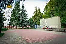 - Мемориальный комплекс. В сквере (возле дома 64А) находится братская могила, в которой захоронено более 630 воинов, в том числе три Героя Советского Союза: младший сержант Г. П. Головенский, рядовой И. И. Дворский, младший лейтенант А. М. Яналов. Памятник был установлен в 1950 году. В августе 1969 года было произведено перезахоронение могил на Советском проспекте, Каштановой аллее и улице Красной на улицу Комсомольскую. Мемориальный комплекс открыт 30 октября 1969 года. Авторами проекта выступили архитектор В. Еремеев, скульпторы М. Дуниман и И. Гершбург[11]. Братская могила и мемориальный комплекс являются памятниками истории[12].