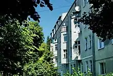 - Жилой дом (№ 80—88). . Под номером 80-88 расположен трёхэтажный жилой дом 1926 года постройки. После Первой мировой войны Восточная Пруссия переживала экономический кризис, в результате вместо вилл возводились преимущественно многосемейные дома[6]. 3 из 5 домов отстоят на 12 м вглубь от красной линии улицы и образуют двор с парком. Торцевые стены двух домов, стоящих около улицы, имеют высокий ступенчатый фронтон, по выходящей на улицу стороне на углу примыкает двухэтажный крытый балкон, стены которого имеют различные горизонтальные деления. Между делениями встроено множество маленьких символических фигур из штукатурки. В отличие от жилого квартала № 49 — 61, где окна имеют форму стоячих прямоугольников, а нижние оконные створки состоят из нерасчленённых стоячих прямоугольников, построенный на 20 лет позже дом № 80 — 88 имеет окна лежачей формы, разделенные поперечинами, из-за которых и отдельные оконные створки превращаются в лежачие формы[1].