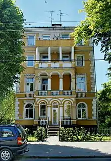 - Жилой дом (№ 47). . Дом с двумя каменными скульптурами львов у входа был построен в 1905 году и является примером типичного жилого дома эпохи модерн. Лаконичные флоральные барельефы фасада, расстекловки, и двери соответствует канонам. Исключение составляют перила лестниц из деревянных балясин в стилистике конца XIX века. Здание сохранило оригинальную входную дверь. На одном из скульптур львов на щите выбита надпись Gronau 1928. По адресной книге 1935 года зданием владел Хьюго Гронау, сдававший квартиры[2]. Скульптуры были созданы одновременно со строительством здания, в 1905 году[6].