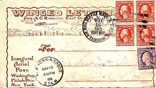 Первый регулярное авиапочтовое сообщение в США открылось 15 мая 1918 года, когда осуществлялась доставка почты из Вашингтона в Нью-Йорк. При этом использовались бипланы армии США типа Curtiss JN-4 «Дженни», на которых летали военные лётчики, с промежуточной остановкой в Филадельфии (аэродром Бастлтон). Среди присутствовавших при отправлении первого рейса из Вашингтона были президент США Вудро Вильсон, главный почтмейстер США Альберт С. Берлсон, помощник министра ВМС США Франклин Д. Рузвельт. Лейтенант Джордж Л. Бойл был выбран для пилотирования самолёта № 38262 во время первого рейса в северном направлении, который, к сожалению, оказался несколько менее успешным[16].