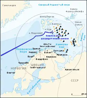 Сопровождавшая конвой крейсерская группа под командованием адмирала Гамильтона должна была покинуть конвой на долготе острова Медвежий, однако, прикрывая конвой, зашла дальше. В результате полученных разведданных 4 июля 1942 года из Адмиралтейства поступил личный приказ первого морского лорда Дадли Паунда: «Конвою рассеяться!». Крейсерская группа получила приказ отойти на запад из-за опасения атаки вышедшего в море немецкого соединения во главе с линкором «Тирпиц».