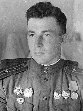 Звание Героя Советского Союза посмертно присвоено указом Президиума Верховного Совета СССР 26 октября 1944 года за 160 успешных бомбардировочно-штурмовых ударов по врагу, 5 лично сбитых самолетов противника и проявленные доблесть и мужество.
