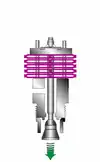 Температура конденсата увеличивается и биметаллические пластины начинают выгибаться, втягивая плунжер по направлению к седлу (направление закрытия – красная стрелка). Это термостатический эффект. Рабочее давление в паровой системе и давление, появляющееся в пространстве между плунжером и седлом (маленькие зеленые стрелки на рис.) за счет вскипания конденсата, действуют в противоположном направлении, открывая конденсатоотводчик (большая зеленая стрелка на рис.). Это термодинамический эффект.