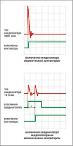 Работа механического контактора на емкостную нагрузку значительно отличается от работы на активную. Пусковые токи и разрушающее воздействие здесь в сотни раз больше. В момент подключения конденсаторов сопротивление конденсатора близко к нулю и контакты работают практически в режиме короткого замыкания. На время переходного периода (от 1 до 2 мс) возникают токи с высокой амплитудой и частотой (от 3 до 15 кГц). Амплитуда подобных токов, известных как «бросок зарядного тока», зависит от следующих факторов: