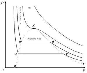 abcKdef — бинодаль (граница между однофазным и двухфазным состояниями; область под колоколом бинодали — область двухфазного равновесия жидкость — пар)