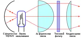 Назначение конденсора — направить как можно больше светового потока источника света, прошедшего через проецируемый предмет, в объектив проецирующей оптической системы. Поэтому конденсор выполняют как объектив, строящий действительное изображение источника света в плоскости первой линзы главного объектива.