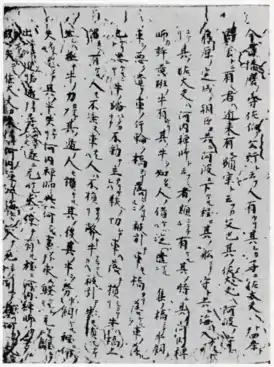 ![]() Фрагмент рукописи Судзука, самого древнего сохранившегося списка Кондзяку моногатари-сю | |
