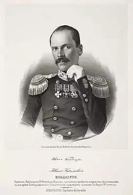 Уже через неделю, 18 (30) ноября 1853 года, в должности старшего офицера 120-пушечного корабля «Три Святителя» участвовал в Синопском сражении и 18 декабря того же года «за отличную храбрость и распорядительность по всем частям управления кораблем» был произведён в чин капитан-лейтенанта[2], а также ему был выдан годовой оклад жалования (Высочайшее повеление от 28 ноября[3]). Позже указами от 20 января[4] и 10 февраля[1] 1854 года он был пожалован кавалером ордена Св. Владимира 4-й степени с бантом и за Синопское сражение, и за бой против 3 турецких пароходов.