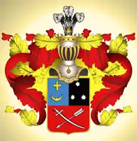 Щит разделён горизонтально на две части, из коих в верхней в правом голубом поле изображены золотой крест и под ним того ж металла полумесяц, рогами обращённый вверх (польский герб Шелига). В левом чёрном поле три серебряные восьмиугольные звезды, одна в верху и две внизу. В нижней части в красном поле положены крестообразно серебряные: сабля и стрела, остриями вниз (изм. польский герб Пржестржал).