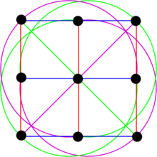 В более общем случае, конечная аффинная плоскость порядка имеет точек и прямых; каждая прямая содержит точек, и каждая точка принадлежит прямой.