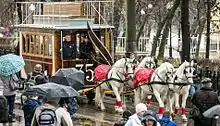 Конка представляла собой открытый или чаще закрытый экипаж, иногда двухэтажный с открытым верхом (империал). Вагон по рельсовым путям тянула пара лошадей, управляемая кучером. В местах, где линии конки пересекали крутые подъёмы, экипажи поджидали форейторы (обычно мальчики-подростки), которые подпрягали ещё 1—4 пары лошадей и помогали преодолеть трудное место, затем на ровном участке выпрягали дополнительных лошадей.
