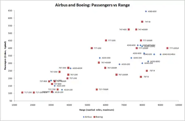 Следует отметить, что в сегменте вместимости самолётов от 120 до 800 пассажиров Boeing до недавнего времени выпускал пять моделей (по возрастанию вместимости): 737, 757, 767, 777, 747. В том же диапазоне вместимости Airbus обходился тремя — A320, A330/340 (одинаковые по вместимости самолёты, различающиеся лишь количеством двигателей) и A380 (модели A300 и A310 числились в каталогах лишь номинально; реальных заказов на них не поступало). В настоящее время Boeing снял с производства модель 757, однако тот же диапазон пассажировместимости перекрывают четыре модели: 737, 787, 777 и 747-8. У Airbus по-прежнему три модели — A320, A350 и A380. Модели Boeing 767 и A330/340 продолжают производиться до начала или стабилизации производства приходящих им на смену моделей.