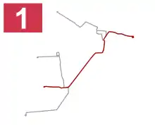 Схема маршрута 1 - № 2 ул. Рябошапко — ул. Успенско-Троицкая — ул. Прорезная — ул. Свободы — проспект Мира — ул. Успенско-Троицкая — ул. Исполкомовская — ул. Конотопских Дивизий — ул. Сарнавская — ул. Пластунская (обратно ул. Драгомирова — ул. Ярковская — ул. Владимира Великого) — ул. Проектная — ул. Дружбы — ул. Михаила Грушевского — ул. Выровская — завод «Мотордеталь» (50-минутный такт) (наиболее протяжённый маршрут)