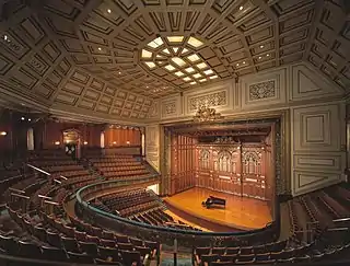 Консерватория тесно сотрудничает с Бостонским симфоническим оркестром с момента его создания в 1881 году (первый состав в значительной степени состоял из преподавателей консерватории). Построенный в 1903 году концертный зал консерватории, знаменитый Джордан-холл (архитектор Edmund M. Wheelwright) вмещает 1051 слушателей и относится к наиболее престижным американским концертным площадкам считаясь одним из лучших концертных залов мира по своим акустическим особенностям. В зале установлен орган спроектированный по образцу органа в соборе Санта Мария Делла Скала в Сиене.[5]