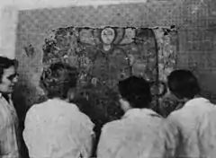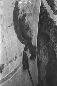 После снятия гипса оставался тонкий, шероховатый и хрупкий оригинальный слой, приклеенный к папиросной бумаге и марле[1]. Изображение переносилось на твёрдую древесно-стружечную плиту, покрытую полиэтиленовой плёнкой, затем осторожно удалялись все остатки гипса, которые просочились на лицевую сторону, неровности в растворе отскребались ножом. По всему периметру картины и в очень тонких местах и убытках накладывалась светлая мастика. Приготовленная таким образом поверхность дезинфицировалась 1% раствором п-хлорометакрезола и закреплялась с помощью 5% раствора ацетилцеллюлозы.
