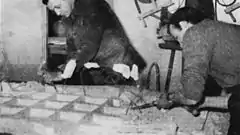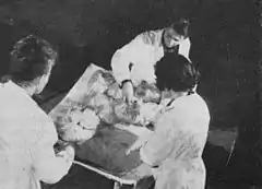 Картины клались горизонтально на толстом слое войлока, покрытым тонкой полиэтиленовой плёнкой. Первым этапом было удаление сетки, которая легко отделялась от нижележащей пластины[1]. Затем с помощью зубила и молотка отбивался слой гипса, усиленного алюминиевой проволокой и наконец, вместе с последним слоем гипса, удалялся оригинальный слой раствора. Большим облегчением было отсутствие между ними соединения[2].