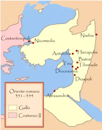 Всё изменилось в 351 году. Правивший Западом император Констант пал от руки узурпатора Магна Магненция, и Констанцию II пришлось сосредоточить своё внимание на западных проблемах. Поскольку восточным провинциям в это время угрожали персы, императору понадобился соправитель, чтобы прочно контролировать этот регион. Поэтому он вызвал Галла к себе, в Паннонию. В Сирмии 15 марта 351 года Галл был провозглашён цезарем и правителем Востока и получил в жёны сестру Констанция Константину (вдову Ганнибалиана Младшего). Он не был усыновлён Констанцием, но стал его сводным братом, в связи с чем именуется в одной надписи divi Constanti pii Augusti nepos[14]. Соправители принесли торжественную клятву, «что в будущем не станут злоумышлять друг против друга»[23]; по-видимому, Констанций II таким образом хотел исключить вероятность мести кузена за отца и брата[14].