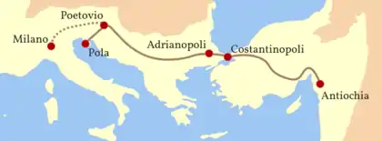 Констанций и после этого не оставил попыток выманить к себе сводного брата. Сначала ему удалось вызвать сестру, Константину, но та в пути заболела лихорадкой и умерла в Вифинии, на станции Кен Галликанский. Галл, получивший от Констанция несколько писем, колебался; он не доверял кузену, но в то же время не мог положиться и на своё окружение, чтобы начать гражданскую войну. Очередной посланец, трибун скутариев Скудилон, убедил его, что август хочет дать ему в управление Галлию. Цезарь отправился на Запад, причём в пути, в Константинополе, устроил гонки на колесницах и собственноручно возложил венок на голову победителя[46]. Констанций, узнав об этом, пришёл в ярость. Чтобы исключить вероятность мятежа, он удалил гарнизоны из всех городов на маршруте Галла и постепенно окружил приближавшегося к нему кузена своими людьми. Наконец, в городе Петовион в Норике комит Брабацион арестовал Галла, снял с него императорское облачение и увёз в Истрию, в окрестности города Пола, где в 326 году был убит его двоюродный брат Крисп[47].
