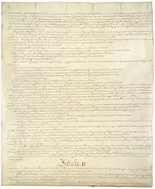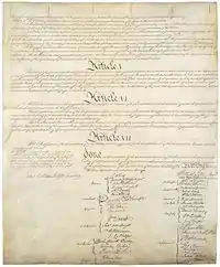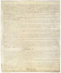 Конститу́ция США (англ. United States Constitution) — основной закон Соединённых Штатов Америки, имеющий высшую юридическую силу[1]. Конституция США была принята 17 сентября 1787 года на Конституционном Конвенте в Филадельфии и впоследствии ратифицирована всеми тринадцатью существовавшими тогда американскими штатами. Считается первой в мире конституцией в современном понимании. Состоит из семи статей, за время действия Конституции были приняты двадцать семь поправок, которые являются её неотъемлемой частью.