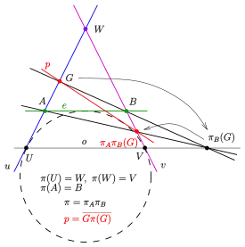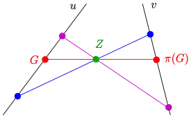 Перспективное отображение пучка в пучок — это биекция, такая, что соответствующие прямые пересекаются на фиксированной прямой , называемой осью перспективного отображения (изображение 2).