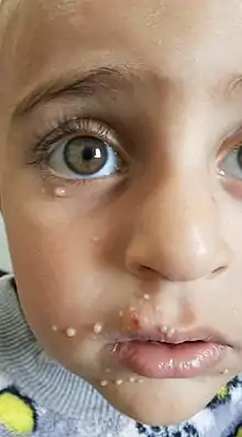 Чаще всего папулы, являющиеся непосредственными признаками этого заболевания, локализуются у детей на лице, туловище и конечностях, у взрослых — в области гениталий, на животе и внутренней части бёдер. Чаще всего папулы: