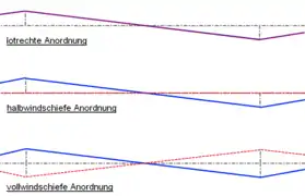 Варианты взаиморасположения несущего троса (красный) и контактного провода (синий) относительно оси пути