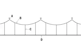 Схема продольно-цепной подвески: A — точки подвеса, B — несущий трос, C — струны, D — контактный провод