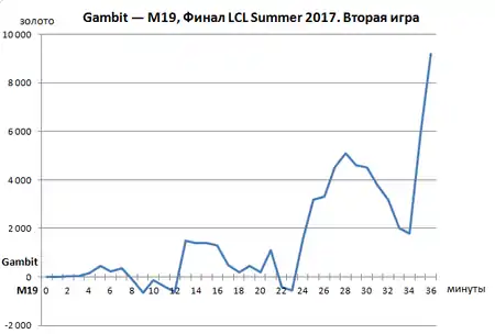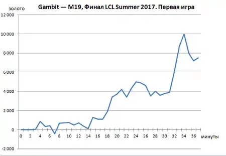На 7-й минуте первой игры финальной серии «M19» захватили преимущество по золоту[19], что стало исходом нескольких сражений[20]. «Gambit.CIS» забрали первую башню в игре, Герольда и двух Нашоров[19], постепенно сокращая своё отставание по золоту[20]. На 37 минуте «гамбиты» убили всех чемпионов «M19» и разрушили их базу[19].