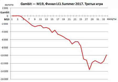 В начале третьей игры «M19» разменялись 4 в 2, уничтожив затем первую башню[19]. На 11-й минуте «Gambit» имели дефицит золота в размере трёх тысяч[19]. Отставание «гамбитов» увеличивалось с ходом игры[20], но на 33-й минуте они убили вражеского персонажа, получав возможность забрать усиление Нашора[21], в то время как игрок «M19» Кирилл «Likkrit» Малофеев в одиночку направлялся на нижнюю линию с целью уничтожения вражеского нексуса[22], на что «Gambit.CIS» среагировали поздно, проиграв из-за этого третью игру — 2:1[23].