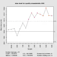 Есть и другие признаки[1]; но установившегося общепринятого набора дополнительных правил чтения контрольных карт нет, поэтому рекомендуется использовать в первую очередь правило Шухарта (выход точек за границы), а все прочие вводить по мере накопления опыта при необходимости.