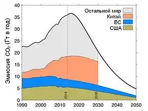 В работе Peters et al. (2015)[2] предложен метод оценки заявлений о намерениях отдельных стран в отношении эмиссии СО2 с точки зрения цели ограничения потепления величиной 2 °С. Методической основой оценки является понятие эмиссионного бюджета СО2. На графике показано, как обещанные сокращения эмиссии трех крупнейших эмиттеров СО2 соотносятся с целью удержания потепления в пределах 2 °С.