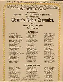 Конференция в Сенека-Фоллз была первым открытым съездом сторонников равноправия женщин.[1][2] Организаторы рассматривали мероприятие как «конференцию для обсуждения социального, гражданского и религиозного положения и прав женщин». Обсуждение проходило в городке Сенека-Фоллз, штат Нью-Йорк, с 19 по 20 июля 1848 года. Оно привлекло внимание широкой общественности, и вскоре состоялся ряд других конференций по правам женщин, в том числе прошедшая через две недели конференция по правам женщин в г. Рочестер, штат Нью-Йорк, и, первая из серии ежегодных национальных конференций по правам женщин конференция 1850 года в г. Вустер, штат Массачусетс.