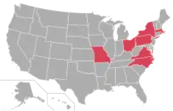 Средний Запад (2 университета) Северо-Восток США (9 университетов) Юг США (5 университетов) |