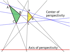 Говорят, что два треугольника ABC и abc находятся в центральной перспективе, если прямые Aa, Bb и Cc пересекаются в одной точке (так называемом центре перспективы). Они находятся в осевой перспективе, если точки пересечения прямых, проходящих через соответствующие стороны треугольников X = AB•ab, Y = AC•ac и Z = BC•bc, лежат на одной прямой, на оси перспективы. Теорема Дезарга утверждает, что эти два условия эквивалентны — если два треугольника находятся в центральной перспективе, то они должны находиться и в осевой перспективе, и наоборот. В этом случае десять точек и десять прямых этих двух перспектив (шесть вершин треугольников, три точки пересечения на оси перспективы и центр перспективы, шесть сторон треугольников, три прямых через центр перспективы и ось перспективы) вместе образуют конфигурацию Дезарга.