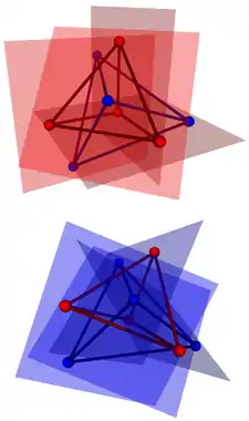 Конфигурацией Мёбиуса или тетраэдрами Мёбиуса называется конфигурация в евклидовом пространстве или проективном пространстве, состоящая из двух взаимно вписанных тетраэдров — каждая вершина одного тетраэдра лежит на плоскости, проходящей через грань другого тетраэдра и наоборот. Таким образом, в результирующей системе восьми точек и восьми плоскостей каждая точка лежит на четырёх плоскостях (три плоскости определяют вершину тетраэдра, а четвёртая плоскость — это плоскость, проходящая через грань второго тетраэдра, на которой вершина лежит), и каждая плоскость содержит четыре точки (три вершины грани тетраэдра и вершина другого тетраэдра, лежащая на той же плоскости).