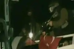 Согласно «ИЦИТ», израильские солдаты были вооружены пейнтбольными ружьями и боевыми пистолетами[62]. Это подтверждается пассажирами одного из кораблей флотилии, которые сообщили, что солдаты имели, либо применяли, пейнтбольные ружья.[103][104][105]. Скриншот видеоролика пресс-службы АОИ — пейнтбольное ружьё.