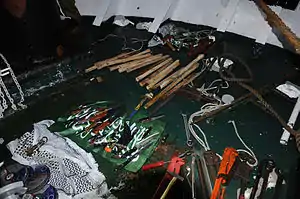 Заместитель министра иностранных дел Израиля Даниэль Аялон сказал, что на борту захваченного корабля было найдено заранее приготовленное оружие (ножи и другое холодное оружие)[11]. Также, в ходе штурма двум пассажирам удалось отобрать у израильских солдат пистолеты и они открыли из них огонь[91] по спецназовцам. По версии Аялона эти люди были задержаны[11], а по версии агентства Ассошиэйтед Пресс — застрелены[91]. На фото, представленных пресс-службой ЦАХАЛа, показаны также дисковые пилы, с помощью которых, по версии израильской стороны, были нарезаны стальные прутья[62][92].