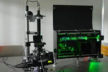 Получили свое развитие и схемы конфокального сканирующего микроскопа Марвина Мински с использованием лазерного излучения[15]. В дальнейшем основное внимание исследователей было направлено на анализ применения флуоресцентных красителей для исследований in vivo и улучшение качества конфокального изображения за счет увеличения интенсивности флуоресцентного излучения.