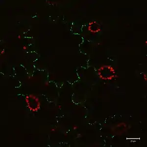 Конфокальная микроскопия обеспечивает возможность прямого, неинвазивного последовательного оптического секционирования интактных толстых живых образцов с минимальными требованиями к их подготовке, а также более высокое латеральное разрешение в сравнении с обычной световой микроскопией[36][37]. Как правило, биологические образцы контрастируют флуоресцентными красителями, чтобы визуализировать их определенные области или органеллы. При этом фактическая концентрация красителя может быть очень низкой, чтобы свести к минимуму воздействие на биологические системы. Так, некоторые конфокальные системы могут отслеживать отдельные флуоресцентные молекулы[38]. Кроме того, трансгенные технологии могут создавать организмы, которые продуцируют свои собственные флуоресцентные химерные молекулы (меченые GFP, green fluorescent protein)[39].