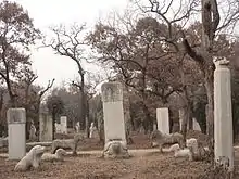 На расстоянии 1 км к северу от Усадьбы Конфуция, вне городской стены Цюйфу, находится Лес (или Роща) Конфуция. Это огромный парковый комплекс, являющийся родовым кладбищем рода потомков Конфуция (рода Кун). Здесь покоится прах самого Учителя и тысяч его потомков. В настоящее время на территории этого кладбища, площадь которого 2 кв. км, насчитывается более 100 тыс. могил, 3600 надгробных камней, 200 статуй, 30 строений и более 5000 каменных стел[4] с эпитафиями. Среди них выделяются захоронения «князей Яньшэнских» (Яньшэн-гун) — потомков Конфунция по старшей линии, занимавших роль феодальных правителей Цюйфу и глав рода Кун. Их могилы, как и захоронения некоторых других особо выдающихся членов рода Кун отмечены мемориальными черепахами, стелами и каменными изваяниями (скульптуры людей и животных)
