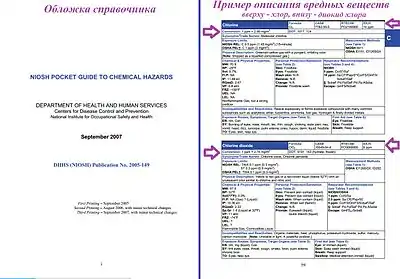 - Michael E. Barsan (Technical Editor). NIOSH Pocket guide to chemical hazards. — Cincinnati, Ohio: National Institute for Occupational Safety and Health, 2007. — 454 с. — (DHHS (NIOSH) Publication No. 2005-149). — Справочник NIOSH по вредным веществам и их свойствам с данными о мгновенно-опасной концентрации этих веществ (более 650 веществ), версия с более новой информацией онлайн на сайте NIOSH.