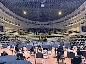 Концертный зал включает партер, три амфитеатра и два балконных яруса. Вокруг сцены полукругом расположены 1505 мест. В зале установлено три рояля Steinway & Sons и орган Rieger-Kloss. Параметры сцены: высота — 15 м, глубина — 20 м, ширина: у органа — 11 м, середина сцены — 20 м, авансцена — 23 м[1][5].
